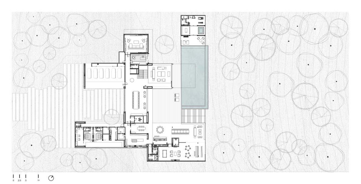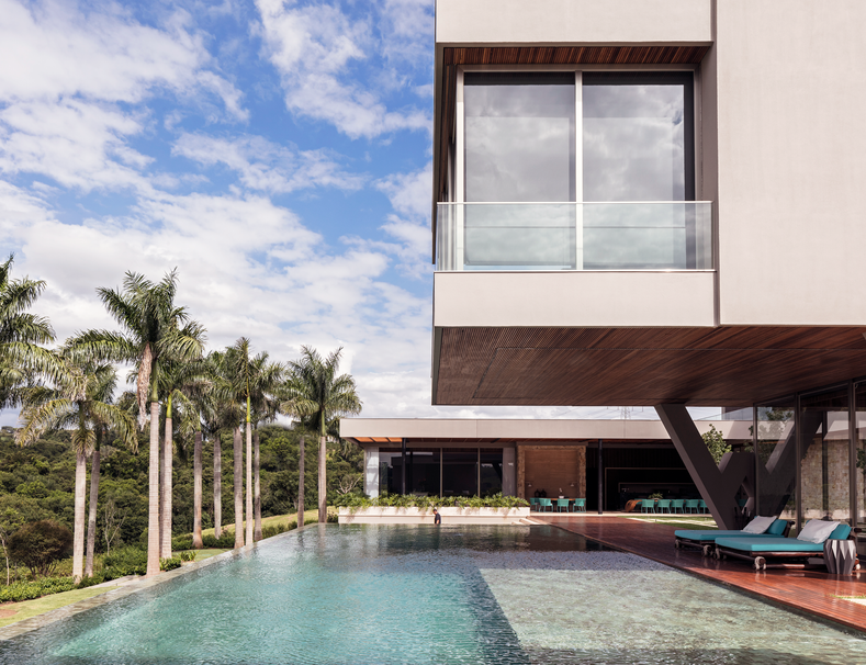 SENDO ASSIM O PÉ DIREITO REGULAR DA CASA POSSUI 4 METROS DE ALTURA, E PARA QUE A ÁREA SOCIAL DA CASA POSSUA O DOBRO DA ALTURA, FOI PROJETADO UM MEZANINO QUE PERMITE GANHAR ESSA ALTURA PARA O AMBIENTE, DESLOCANDO PARA UM BALANÇO SOBRE A PISCINA, O LIVING ELEVADO COM VISTA PARA A MATA QUE CIRCUNDA O TERRENO.